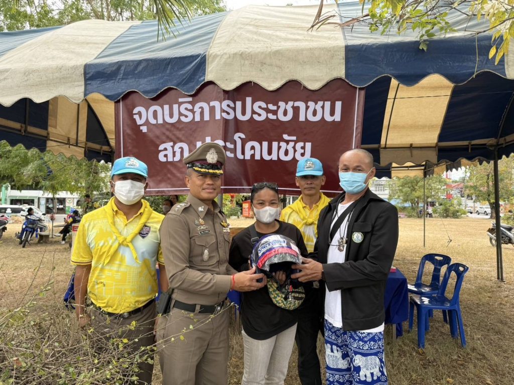 พ.ต.อ.วิษณุ อาภรณ์พงษ์ ผกก.สภ.ประโคนชัยได้แจกหมวกกันน็อคให้กับผู้ขับขี่รถจักรยานยนต์บริเวณแยกประโคนชัยตามโครงการจิตอาสาจราจร รณรงค์การขับขี่ปลอดภัย สวมหมวกนิรภัย เพื่อลดอุบัติเหตุจราจรทางบกช่วงเทศกาลปีใหม่ 2568 ของ ภ.จว.บุรีรัมย์